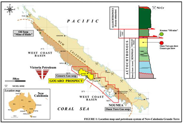 New Caledonia saw some of the earliest exploration in the region with the government-controlled company, the Societe de Recherche et d'Exploitation de Petrole en Nouvelle-Caledonie drilling onshore wells in the 1950s on the Gouaro Anticline with reported hydrocarbon shows. In 1973 Texaco and Coparex filed for licences. In 1999 Victoria Petroleum with partners Sun Resources and Monoco Petroleum drilled the Cadart-1 (Gouaro Prospect) well in the PRA 436 licence on the same anticline drilling deeper into the West Coast Basin. Figure 10 below shows the location of Gouaro Anticline which had reserve potential based on press releases for a discovery in the range of 200 to 1.5 TCFG or 110 to 950 MMBO.