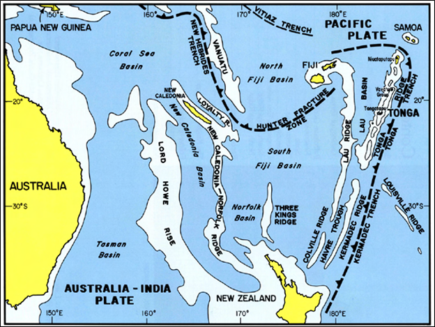 The main tectonic features of the Southwest Pacific, in Figure 2 below, are dominated by subduction with the Pacific Plate subducting westwards underneath the Australian Plate. There are many publications available for those interested to understand the rather complex and diverse tectonics of the region.