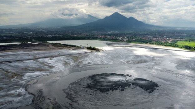 Drone view of the Lusi eruption and the neighboring Arjuno-Welirang volcanic complex in the background.