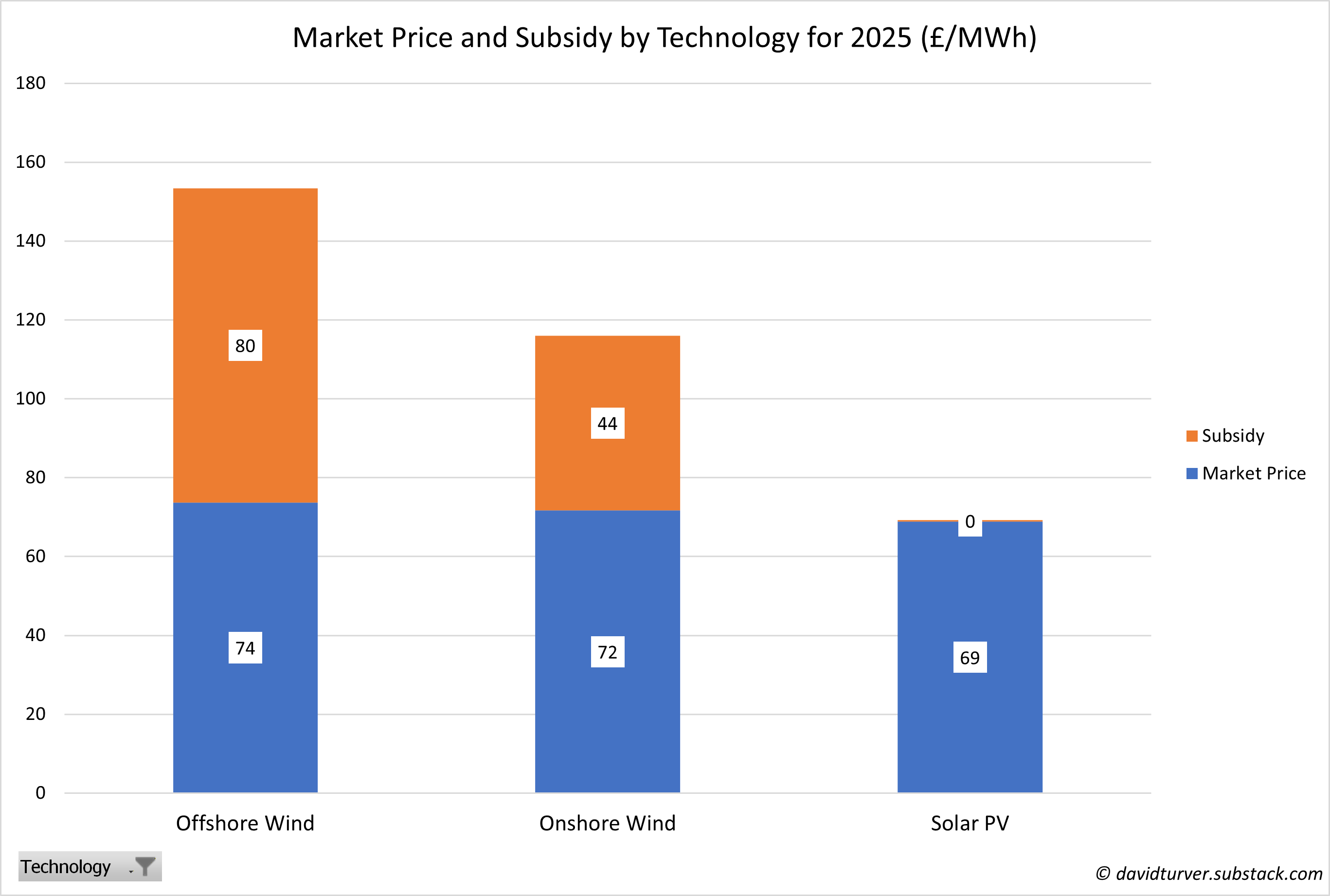Offshore wind received subsidies of £80/MWh, which is more than the intermittent reference price of £67/MWh, meaning that on average CfD funded offshore wind farms got more of their revenue from subsidies (52%) than they got from selling their power on the market. Onshore wind received £44/MWh (38%) and solar got £0.41/MWh (1%) of their revenue from subsidies.