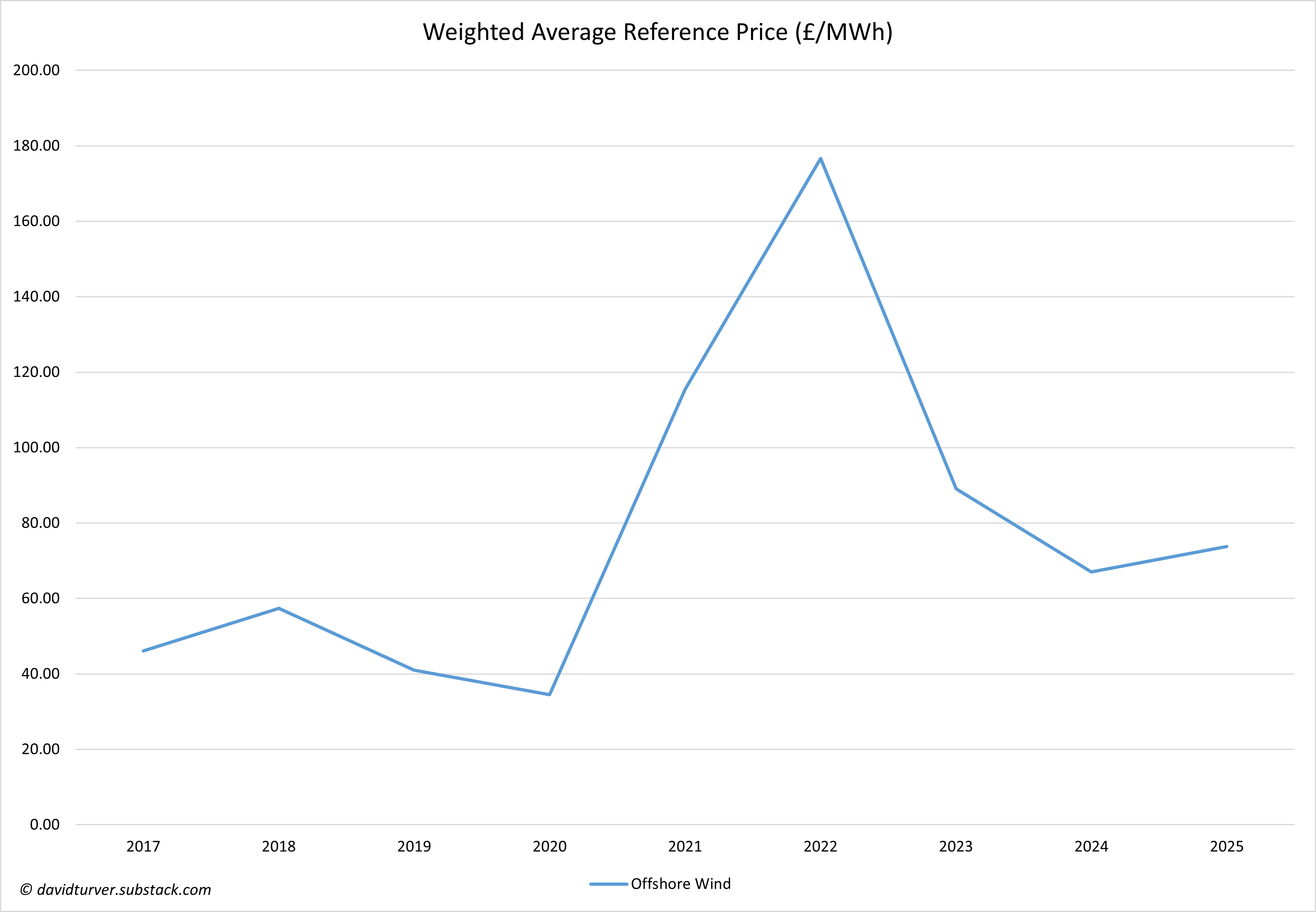 Average offshore wind reference prices were in the range £41-57/MWh from 2017 to 2019. Prices plummeted in 2020 as gas prices and demand fell due to Covid. Prices rose in 2021 to an average of £115/MWh mainly due to the energy crisis that began in the second half of that year. Prices rose again in 2022 to £177/MWh as the energy crisis continued with Russia’s invasion of Ukraine before falling back somewhat to £89/MWh in 2023. Prices fell further in 2024 to £67/MWh before rising again in 2025 to £74/MWh. The increase in 2025 is explained by high gas prices in the early part of the year and rising carbon costs in the latter part of the year that have pushed up reference prices even though gas prices have fallen.