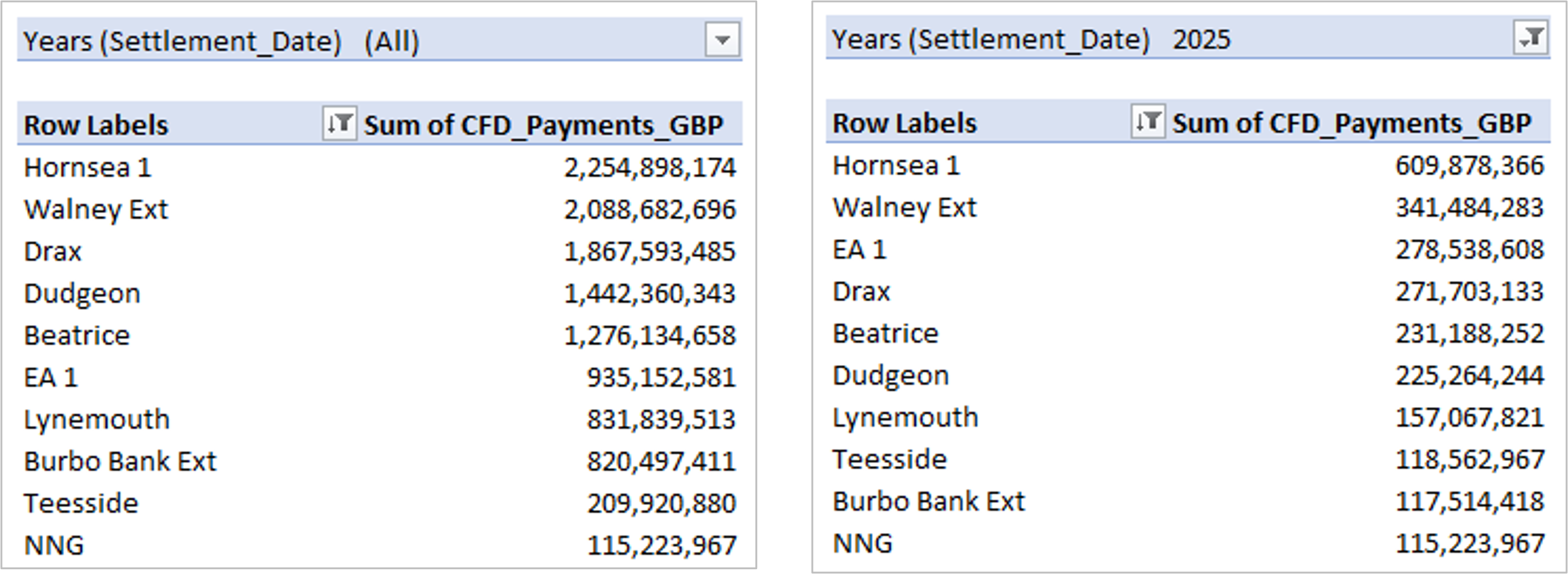 Seven of the all-time Top-10 recipients are offshore wind farms. Hornsea 1 has received the most at £2.25bn, with Walney Extension coming second at £2.09bn. In third place is Drax that has been paid £1.87bn in CfD subsidy for burning trees. The other offshore wind farms in the Top-10 are Dudgeon, Beatrice, East Anglia One, Burbo Bank Extension. Neart na Gaoithe (NNG) is a new entry in 2025, having activated its CfD in April at the very high strike price of £162.82/MWh. Lynemouth and Teesside Biomass plants also make the Top-10.