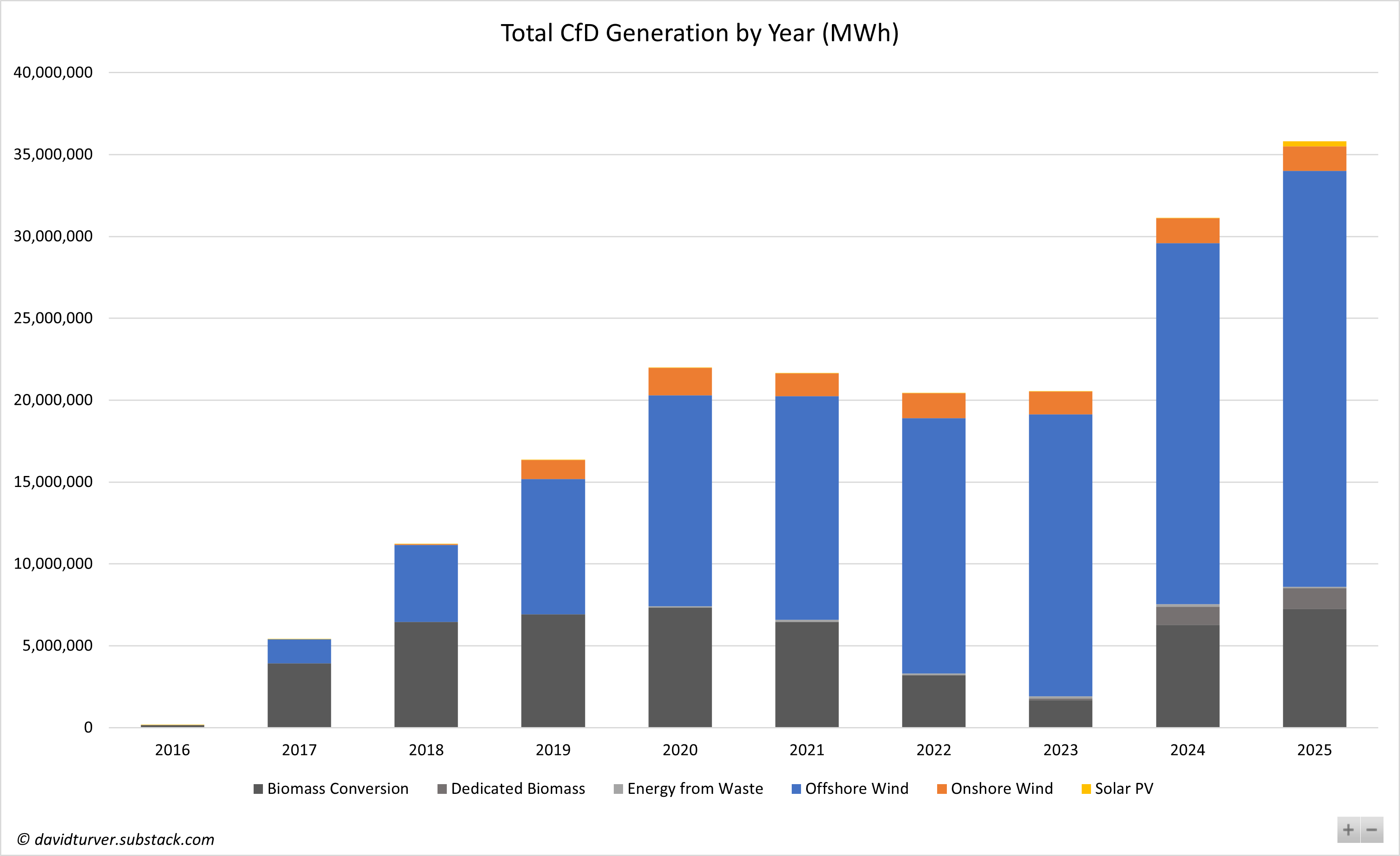 Figure 5 - CfD Generation by Technology and Year (MWh)