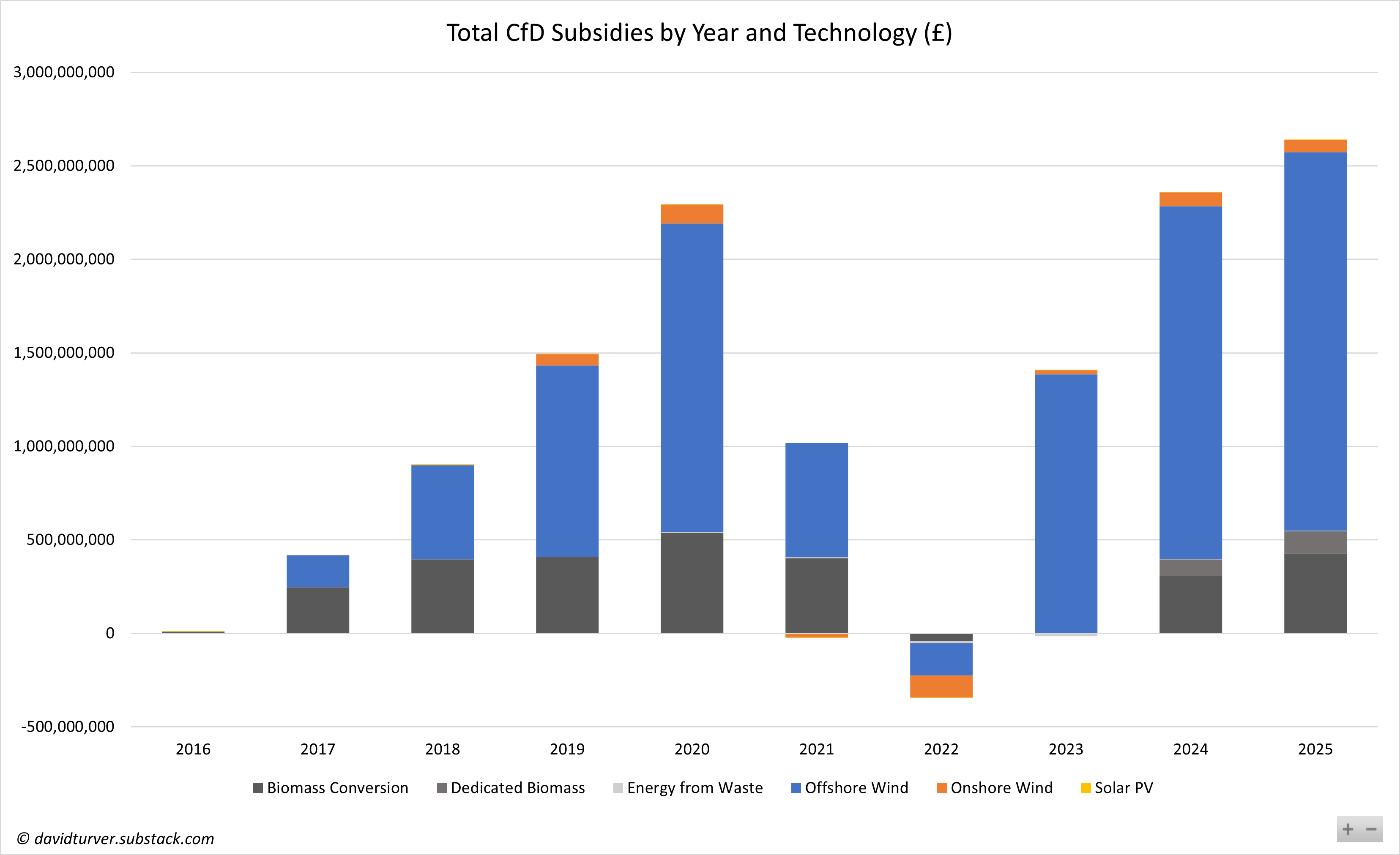 Figure 2 - Total CfD Subsidies by Year and Technology (£)