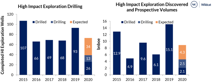 Figure 1: High Impact Exploration activity and discovered volumes 2015-2019, with the projection for 2020. Westwood has classified the wells as either Drilled, Drilling or Expected.