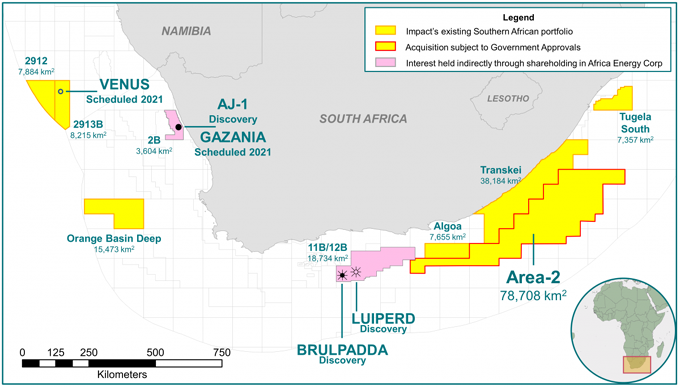 “We are pleased to have concluded this transaction with Silver Wave Energy for Area 2 in deep water South Africa. This acquisition consolidates Impact’s position along the transform margin of the South African Natal Trough, adding over 78,000 km2 of acreage. Importantly, when added to Impact’s Transkei & Algoa licence, this captures the full length of all the large deep marine fans in the Natal Trough, which Impact believes to be a potential super-basin. This combined position offers substantial running room, with multiple play types underlain by very thick and oil-mature Cretaceous source rocks.”