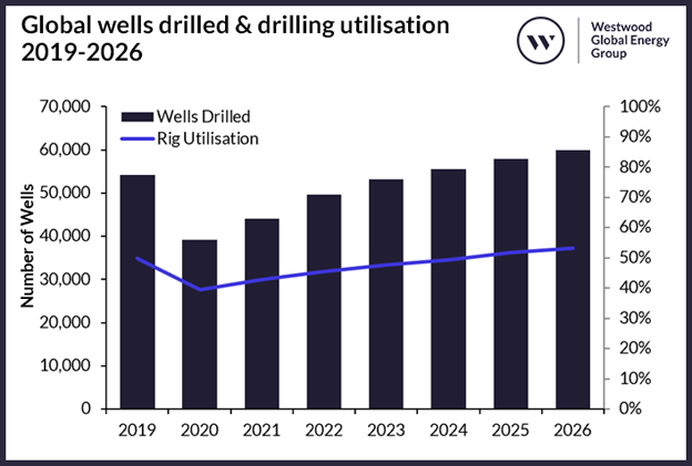 Westwood projects the number of wells drilled over the forecast period (2022-2026) to strongly increase year-on-year, reaching upwards of 60,000 in 2026, compared to c. 49,600 in 2022. Global drilling levels are expected to top 2019 drilling levels in 2024, which was not previously considered in Westwood’s outlook last year. The increase in wells drilled is forecast to lead to a year-on-year growth in the number of rigs operational. Westwood estimates that 4,070 rigs on average will be operational in 2022, growing to c. 5,050 by the end of the forecast, representing an increase of 24%.
