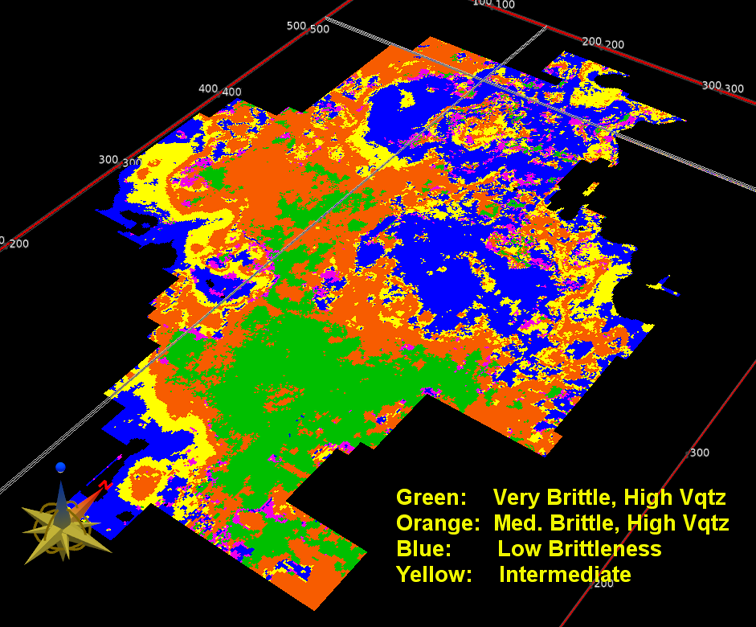 Bayesian facies analysis of a Barnett Shale data set. Green represents litho-facies with the highest quartz content and the greatest brittleness. Image courtesy of CGG GeoSoftware. (Image source: CGG)