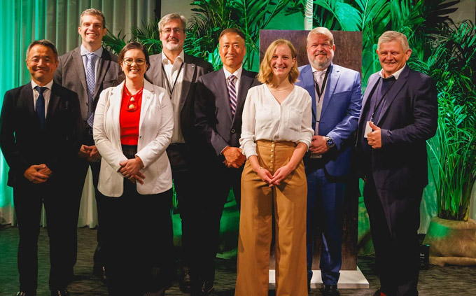 Three new partners, from left: Arinobu Hashimoto (Mitsui & Co), Marcelo Pereti (Belterra), Gabriela Savian (Ipam), Eduardo Figueiredo (Hydro), Hayato Yanagisawa (Mitsui Foundation), Birgit Euba (Mercedes), Anderson Baranov (Hydro), John Thuestad (Hydro). (Photo: Tim Oliveira/Hydro)