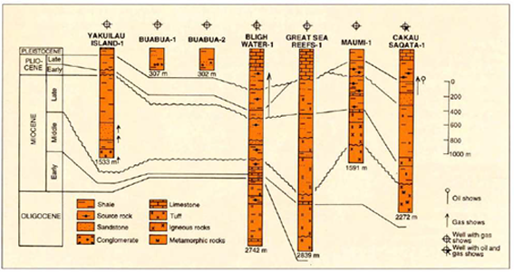 Fiji then saw a series of on- and offshore wells drilled in complex geology between 1980 and 1982. By this time operators included Chevron, a Worldwide Energy Corporation led by PEML and Bennett Petroleum. Chevron drilled Bligh Water-1,Great Sea Reefs-1, PEML Buabua-1 and 2, Bennett Maumi-1 and Cakau Saqata-1, whilst Worldwide Energy Corporation drilled Yakuila Island-1. Figure 6 below is a well correlation taken from a South Pacific Applied Geoscience Commission (SOPAC) publication (Rodd, 1993).