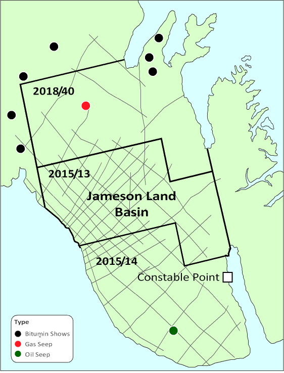 Localities of bitumen shows and oil and gas seeps in the Jameson Land Basin. ARCO 2D seismic coverage shown. (Map source: KeyFacts Energy)