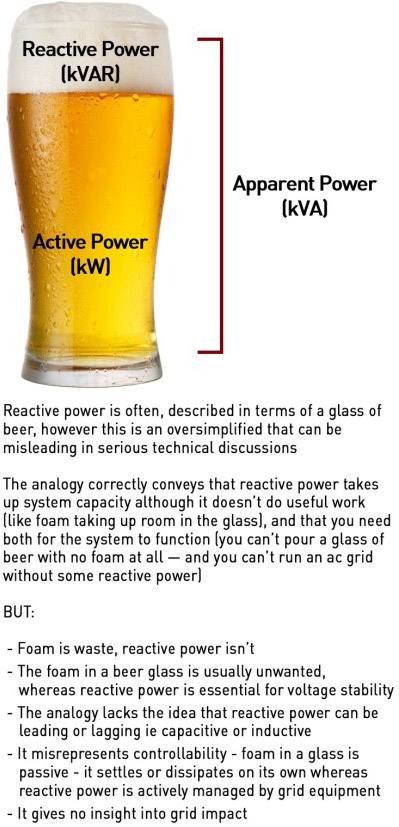 Not being able to properly explain reactive power is common in the energy industry – ask a dozen people to explain it and you’ll get twelve different answers. Most will reach for the beer-glass analogy where real power as the liquid and reactive power is the froth, or mutter something about “energy sloshing back and forth” on the grid. More sophisticated responses will mention capacitors “injecting vars” and inductors absorbing them. These phrases are repeated so often that they’ve become folklore. Unfortunately none of them describes what actually happens in power grids.