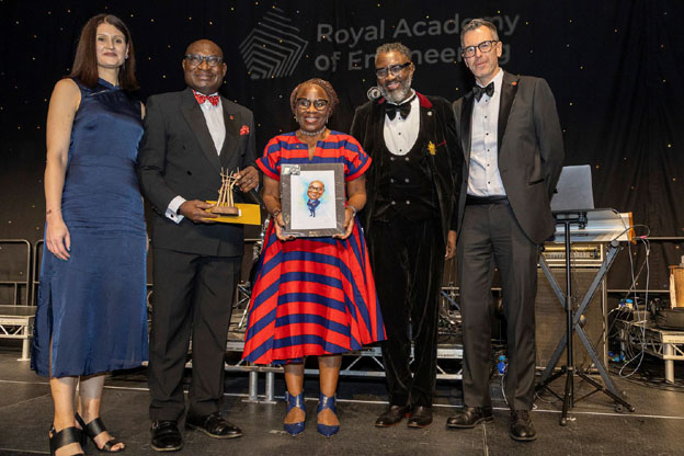 Special Appreciation Award (L-R) Sylvia Hampartumian (Royal Academy of Engineering), Winner Dr Nelson Ogunshakin OBE FREng, his wife Helen, Dr Ollie Folayan MBE (AFBE-UK), Mark Ewen (Mott MacDonald)