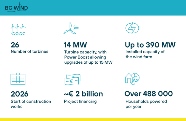BC-Wind is an offshore wind project developed by Ocean Winds in the Polish Exclusive Economic Zone of the Baltic Sea. Located approximately 23 kilometers north of the coastline, near the municipalities of Krokowa and Choczewo in the Pomeranian Voivodeship. The wind farm will comprise 26 turbines with a capacity of 14 MW each, equipped with the Power Boost feature that increases output to 15 MW, with a total planned capacity of up to 390 MW.