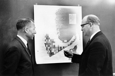 On 9 April 1965, the Storting (parliament) adopted rules for petroleum exploration and production on the Norwegian continental shelf below the 62nd parallel (the northern limit of the North Sea). The Norwegian sector was divided into 36 quadrants, each subdivided into 12 blocks. One block covered about 500 square kilometres. A mere four days later, the first – and by far the largest – Norwegian offshore licensing round was announced. With 278 of 314 blocks on offer, nobody was to be in any doubt about the government’s willingness to make a commitment. At the deadline of 15 June, 11 applications had been received for 208 blocks. The Ministry of Industry awarded 78 production licences to eight groups of companies on 17 August. Phillips, which had shown early interest in the Norwegian North Sea, received acreage together with Fina and Agip in the Phillips group. Norsk Hydro participated in the Petronord group with seven French companies. Other players included some of the world’s biggest oil companies, such as Esso, Shell and Amoco.