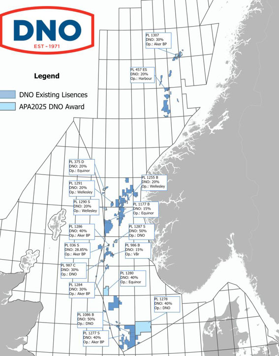 DNO ASA, the Norwegian oil and gas operator, today announced that its wholly-owned subsidiary DNO Norge AS has been awarded participation in 17 exploration licenses, of which four are operatorships, under Norway's Awards in Predefined Areas (APA) 2025 licensing round.