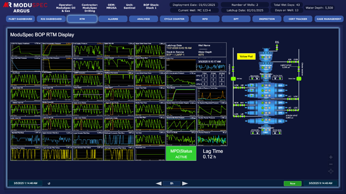 At a glance: ModuSpec’s Argus BOP RTM dashboard displays live pressure, status and flow data, giving drilling teams a single view of critical well-control parameters. Photo: ModuSpec/RM Group