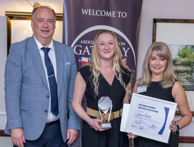 During this year’s Aberdeen-Houston Gateway hosted by Granite PR at Macdonald Norwood Hall Hotel, Jacqui Watt was named as recipient of The Travis Middleton Memorial Connector of Excellence Award. The accolade was created in memory of one of the driving forces behind the creation of the annual event and was presented by his widow, Jo. The award is presented annually to recognise an individual who embodies the spirit of the event and has demonstrated exceptional skills in fostering relationships, creating opportunities and driving business through effective networking and connection building.