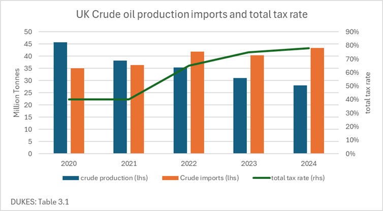 The Windfall tax was designed as a revenue-raising tax rather than an environmental one, such as the three ‘Carbon Taxes’ discussed above. But it has reduced UK carbon emissions by curtailing oil and gas production. In 2021, the UK produced 38.241 million tonnes of crude oil. In 2022, despite the price spike following Russia’s invasion of Ukraine, UK production dropped to 35.348 million tonnes, most likely due to the introduction of the 25% windfall tax. In 2023, when the windfall tax was increased to 35%, production fell again to 31.102 million tonnes. In 2024, when the tax was increased to 38%, production fell to 28.019 million tonnes. But the UK’s demand for crude oil didn’t change in line with the tax increase; instead, crude oil imports (from countries without a Windfall Tax) increased from 35.58 million tonnes in 2020 to 43.39 million tonnes in 2024. Increasing the UK’s trade deficit.